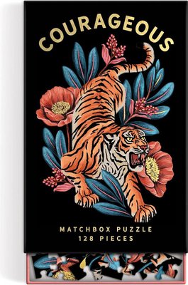 Raxenne Manniquiz of a tiger and flowers on black background. This puzzle is uniquely packaged in matchbox-style box with slide-out drawer, pefect for gifting, reuse, and storage. * 128 Pieces * Box: 5 x 3.25 x 1.32", 127 x 82.55 x 33.5 mm * Puzzle: 8.825 x 5.75", 224 x 146 mm * Foil Stamped Matchbox-style box