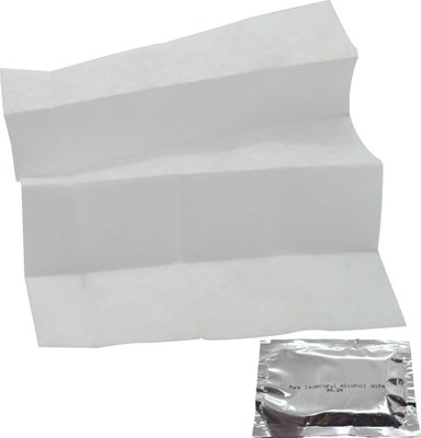 Individually wrapped 99.8% isopropyl alcohol wipe intended for cleaning and disinfecting all surfaces.