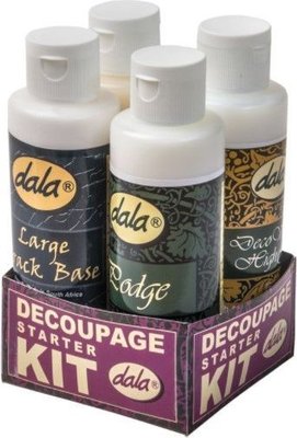 The Dala Deco Starter kit is complete with 4 bottles of decoupage medium. This kit is perfect for small decoupage projects and for those trying their hand at decoupage. Available in a set of 4 x 125ml bottles as follows:125ml - Deco Varnish 125ml crackle glaze 125ml large crack base 125ml podge