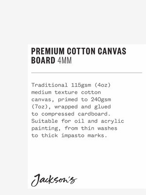The 115gsm (4oz) traditional medium texture weave cotton used on these Premium Cotton Canvas Boards is suitable for oil and acrylic painting - from thin washes to thick impasto marks, and is universally primed to 240gsm (7oz) to protect the natural fibres of the cotton. Each board is 4mm thick and extremely rigid, with the canvas wrapped around the edges and glued to compressed cardboard. - This is a single Premium Cotton Canvas Art Board, 4mm, 3x4in (7x10cm) in size