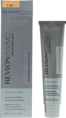 Revlon Revlonissimo colorsmetique colour and care permanent hair colour enriched with hyaluronic acid and soy protein. Formulated as if it contained a hair mask. It provides up to 100 percent grey hair coverage. Suitable for all hair types. Ideal for all colour services, From lightening to darkening or fantasy effects and highlights. Perfect for ultimate results with an even greater shine. It protects the lipid layer of the hair. Comes in no. 7.44 Deep Blond Copper colour.