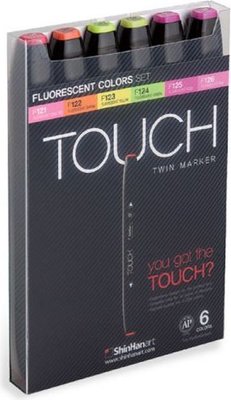 ShinHan : Touch Twin 6 Marker Pen Set : FlourescentShinHan Art's Touch Twin markers are now available in a total of 204 brilliant colours, ideal for a diverse range of uses, from animation, illustration, architectural renderings and interior design sketches. With a unique fine point nib on one side and a broad chisel nib on the other, the Touch Twin marker offers artists and designers a greater range of line thicknesses than ever before.The delivery of ink flow can be perfectly controlled to allow precision drawing. The ergonomically designed rectangular body resists rolling on work surfaces and provides a perfect grip that avoids smudges and smears. A specially designed safety cap stacks neatly and prevents damage to the nibs. The new Touch Twin marker contains an alcohol-based ink that does not dissolve printed ink toner, allowing for odourless, vividly coloured artwork on printed materials.Please note, due to trading agreements we are unable to ship ShinHan products to Russia.